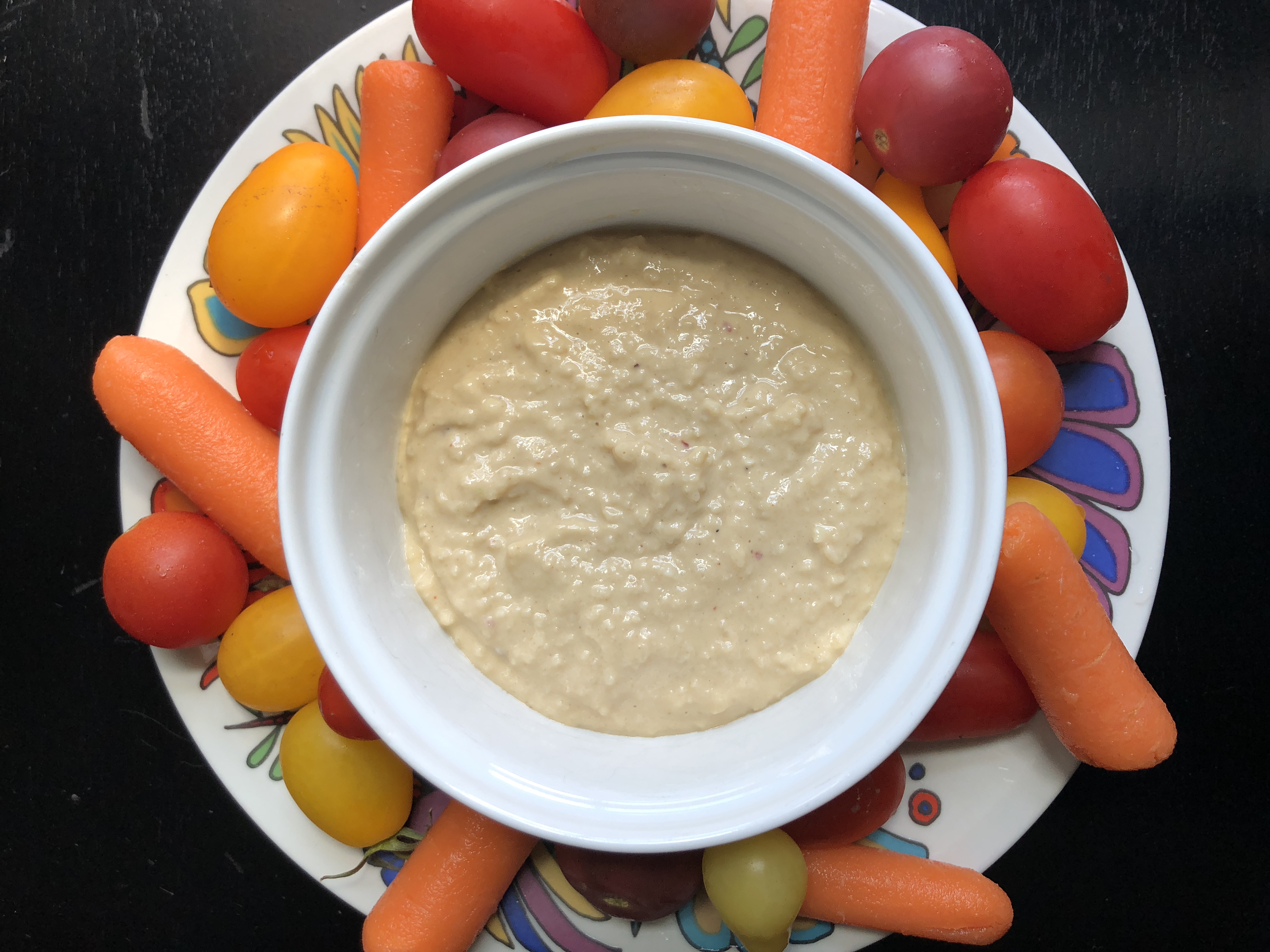 Problem was, I was so blown away by almost everything we had (and sooooooooo exhausted), that I didn’t even think to ask how it was made. When I got home, then, I had to reverse engineer it on my own. After a couple of misfires, I finally came up with a recipe that we think tastes exactly like traditional chickpea hummus. My first few attempts ended up either grainy or like tahini/garlic flavored almond butter. Uh, bleh. But eventually, success! My hummus dreams were realized (a sentence I never dreamt I would type).