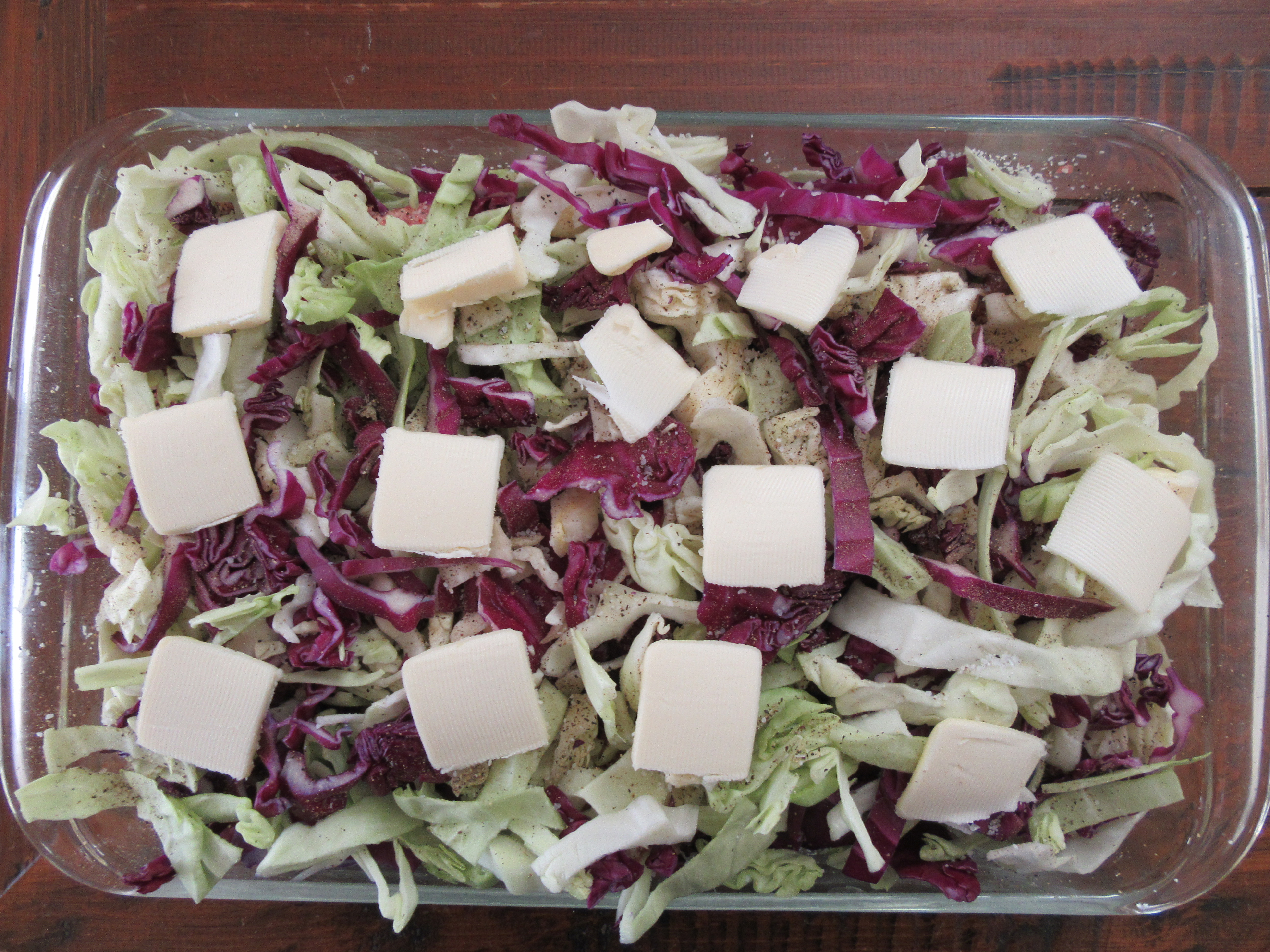 Put down one layer of the shredded cabbage. Dot with butter. Cover with half the uncooked crumbled sausage. Sprinkle liberally with salt and pepper. Repeat another layer (cabbage, butter, crumbled sausage), ending with a layer of cabbage dotted with butter. Don’t skimp on the salt and pepper in this recipe. You are using so few ingredients, you need to make sure you are generous with those you do use.
