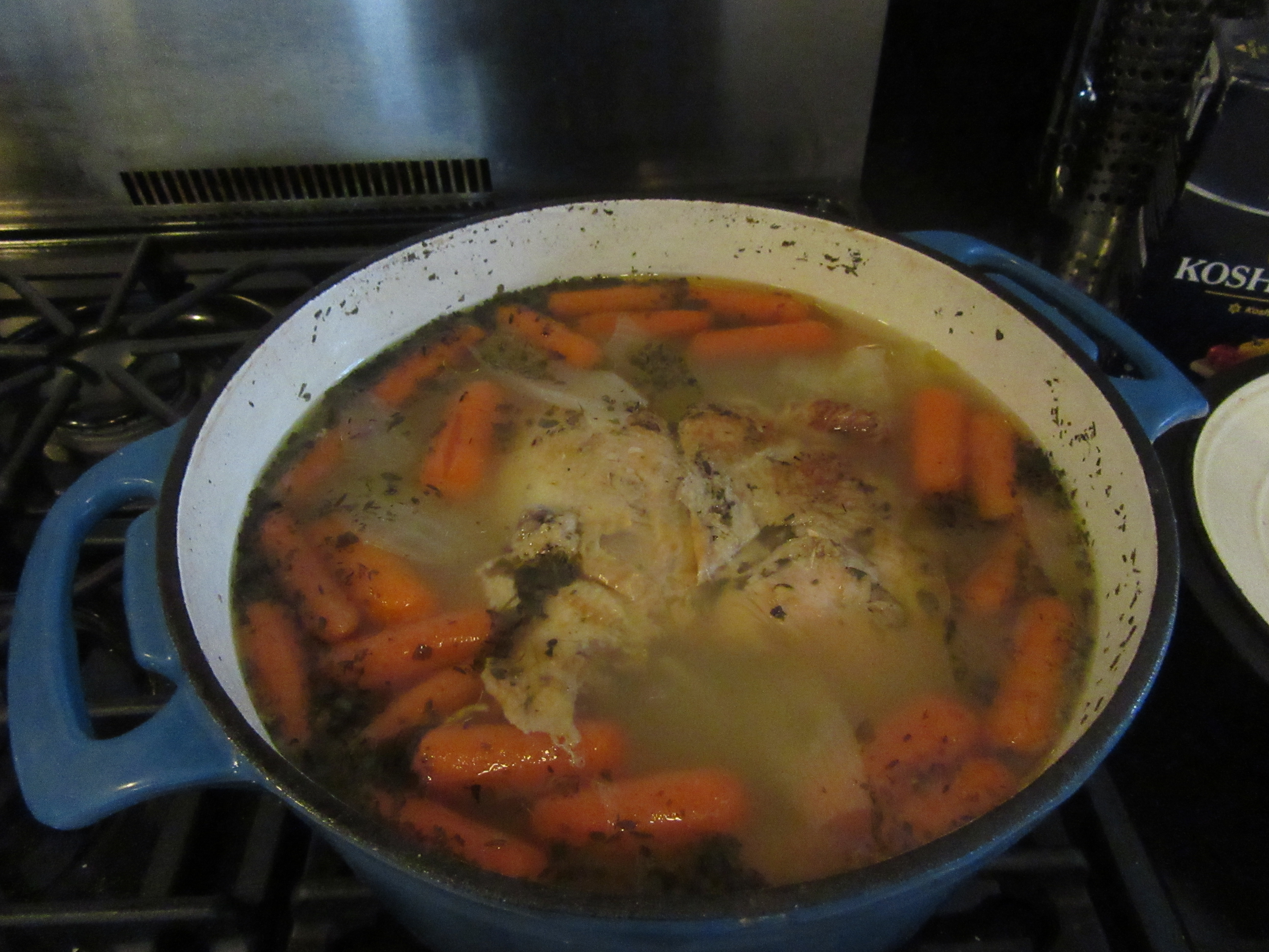 This morning, after my first run, I pulled a chicken carcass out of the freezer. Much to Tim’s dismay, my laundry room freezer is stuffed full of carcasses (That is the proper pluralification, people. I looked it up. Just ignore the word if you’re a professional grammarian. I’m not consciously trying to drive you crazy.). Every time we have any sort of dish involving roast chicken, which is often since I love roast chicken in about 100 things, I stash the leftover bird in the freezer. Then, about once a week, I throw it in a pot with some water, seasonings and vegetables and let it do it’s thing while I do my thing. Eight to twelve hours later, shazam!, chicken broth.